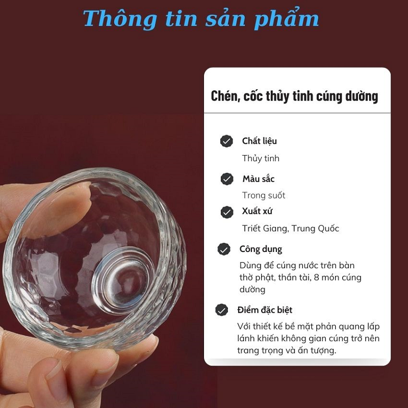Chén Nước Cúng Phật Bằng Thủy Tinh là vật phẩm không thể thiếu trên bàn thờ Phật, bàn thờ gia tiên hay bàn thờ Thần Tài – Thổ Địa. Được chế tác từ thủy tinh cao cấp trong suốt, chén mang vẻ đẹp thanh khiết, phản chiếu ánh sáng lấp lánh, tạo nên không gian thờ cúng trang trọng, tinh tế và thanh tịnh.