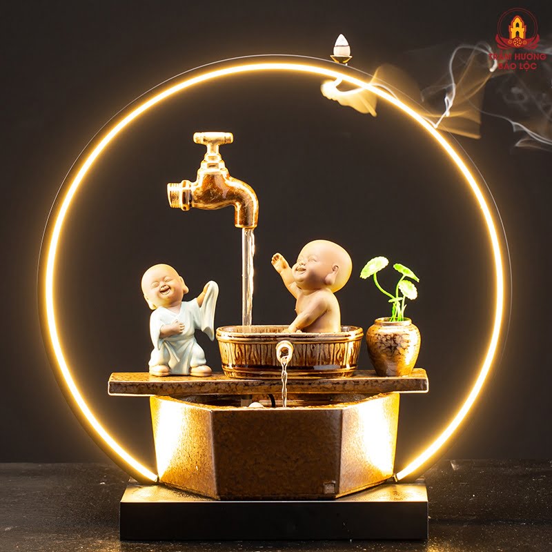 Mẫu thác khói trầm hương chú tiểu gánh nước được thiết kế vô cùng tinh tế.