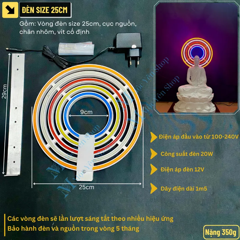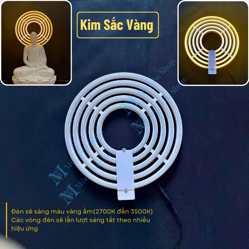 Đèn Hào Quang Led Neon là sản phẩm trang trí cao cấp, được thiết kế tinh xảo với ánh sáng rực rỡ và trang nghiêm, giúp tôn lên vẻ đẹp thiêng liêng của tượng Phật, tượng Bồ Tát . Với hai phiên bản ánh sáng nổi bật — Ngũ Sắc (xanh dương, vàng đậm, đỏ, trắng, cam) và Kim Sắc Vàng (vàng ấm) — sản phẩm mang lại hiệu ứng lung linh, tạo cảm giác bình an và tôn kính trong không gian thờ tự