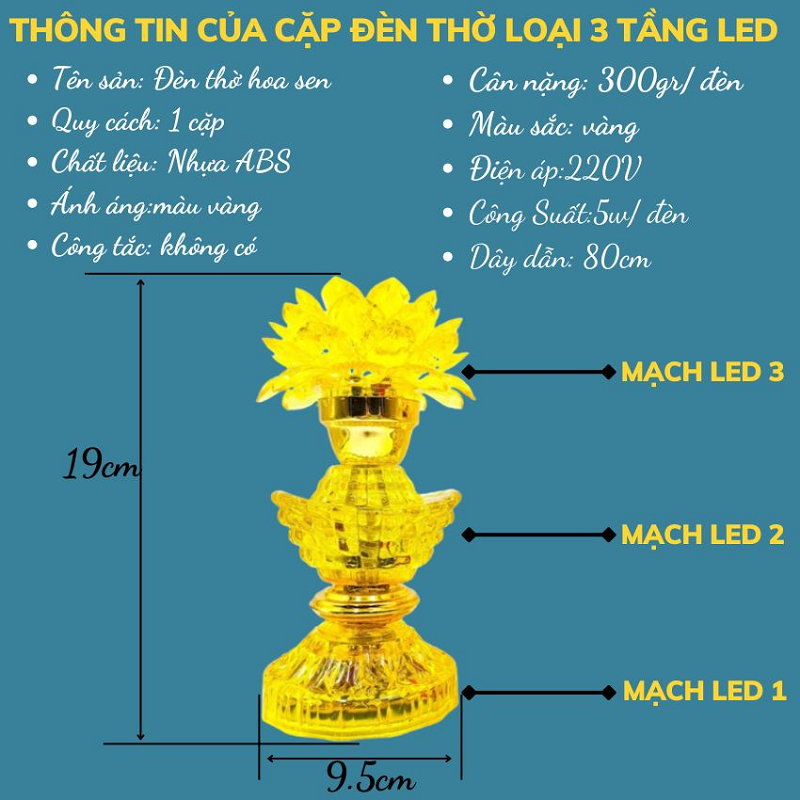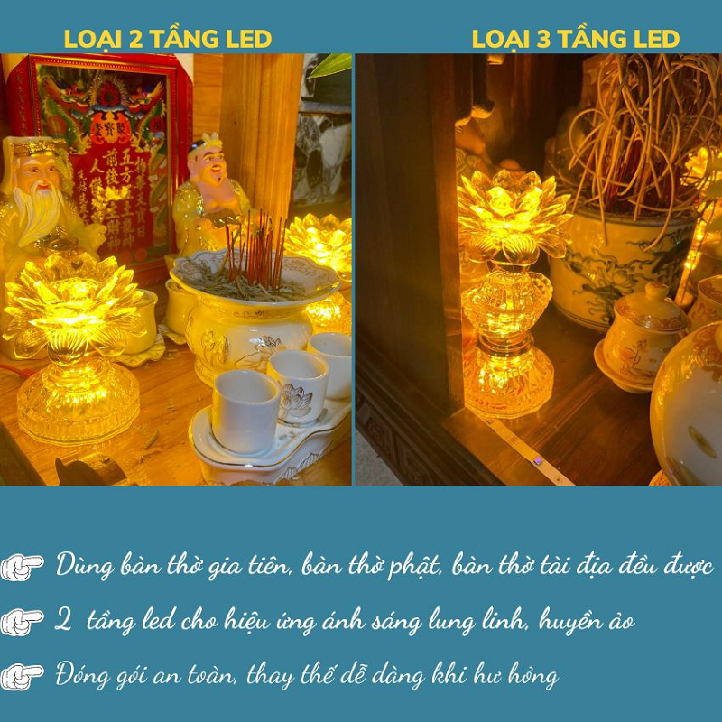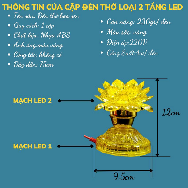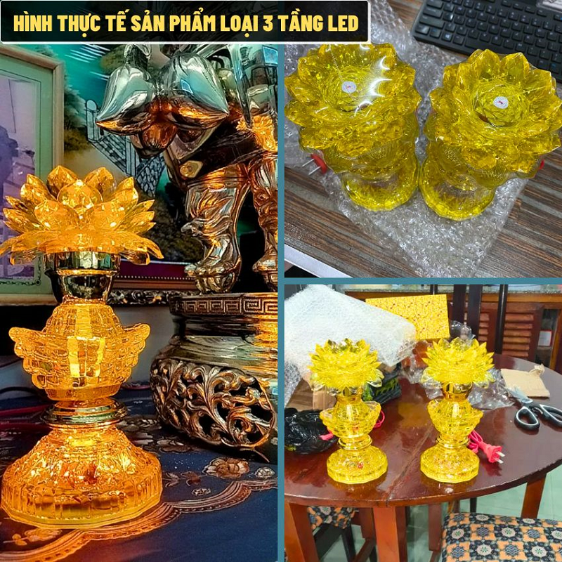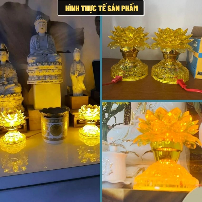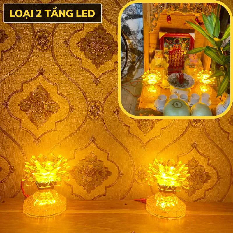 - Bộ 2 Đèn Thờ Hoa Sen Màu Vàng là lựa chọn hoàn hảo cho không gian thờ cúng Phật, Ông Bà, Gia Tiên. Với thiết kế hoa sen 2 hoặc 3 tầng LED, ánh sáng vàng ấm áp, dịu nhẹ, sản phẩm mang lại cảm giác thanh tịnh và trang nghiêm. Đèn được làm từ nhựa cao cấp trong suốt như pha lê, phản chiếu ánh sáng lung linh, giúp không gian thờ trở nên rực rỡ và sang trọng hơn.