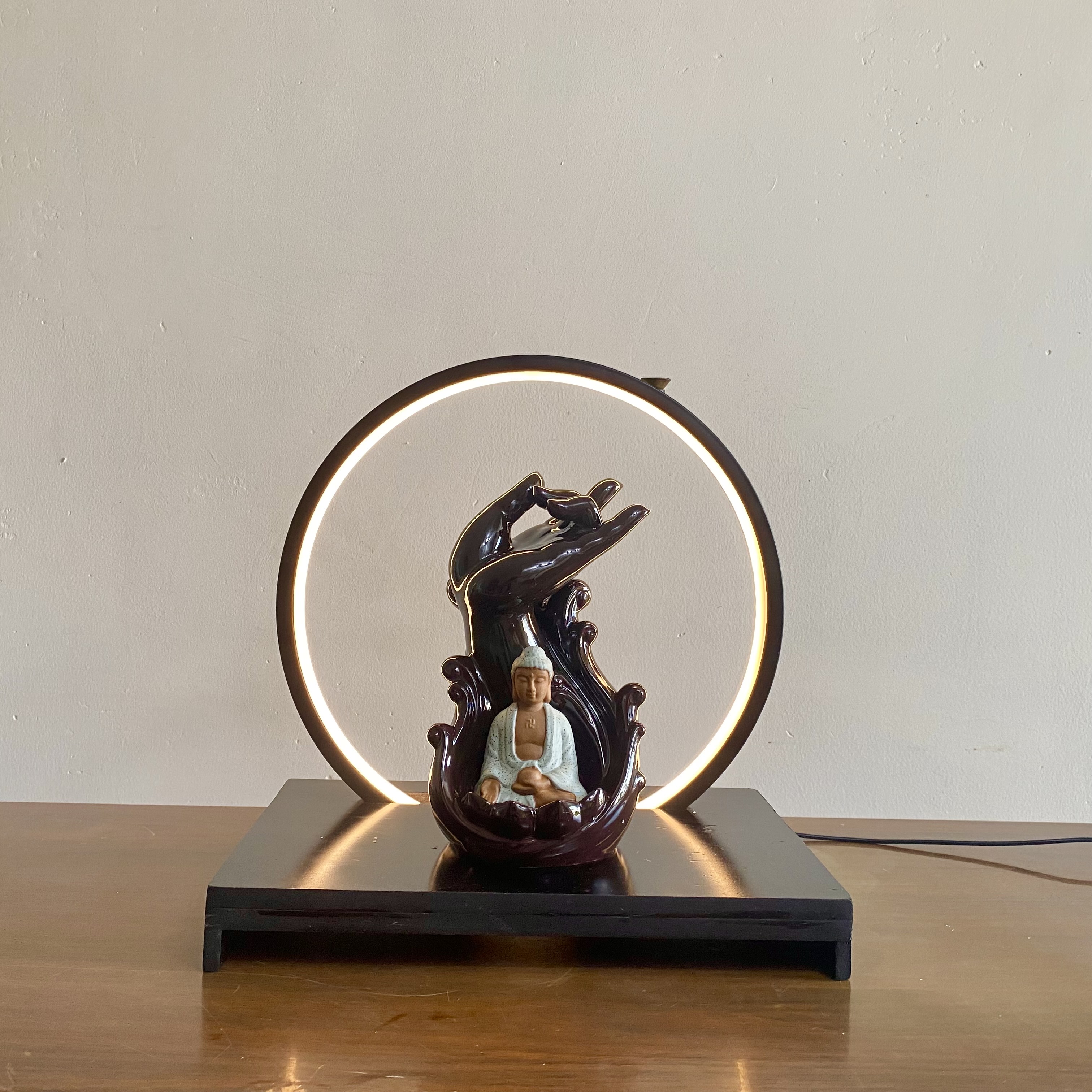 Thác khói trầm hương Mẫu Như Lai kết hợp kệ đèn Led chỉnh màu là 1 sản phẩm kết hợp giữ kệ đèn và thác khói Như Lai, đi kèm với phụ kiện chuyên phù hợp để nhưng không gian phòng khách, trà đạo,... Vừa là 1 sản phẩm phong thuỷ, vừa là 1 sản phẩm decor. Luôn mang lại sự nhẹ nhàng khi ngắm nhìn dòng khói trầm nhè nhẹ thơm thơm giữ dòng ánh sáng vàng ấm