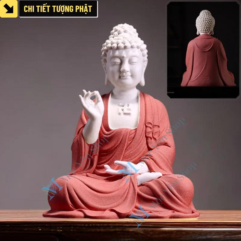 - Tượng được làm từ gốm trắng phủ men ánh kim. Bề mặt gốm bóng mịn, phản chiếu ánh sáng nhẹ nhàng, làm nổi bật từng chi tiết trên gương mặt Phật – từ ánh mắt hiền từ, nụ cười an nhiên cho đến tư thế thiền định trang nghiêm.