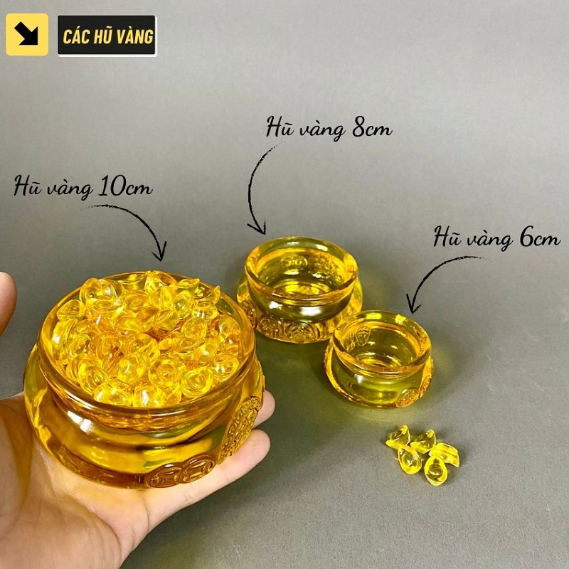 - Hũ vàng 6cm: Đường kính 6cm – Cao 2.7cm – Nặng 100g