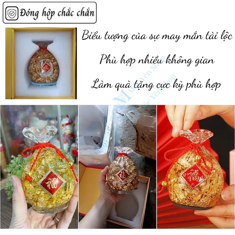 • Nhờ thiết kế tinh xảo, bên trong túi là vàng lá óng ánh – biểu trưng cho của cải, công danh và thành công không ngừng sinh sôi. Đây là món quà ý nghĩa để tặng trong dịp Tết, tân gia, khai trương, sinh nhật hoặc chúc phát tài phát lộc cho người thân, bạn bè, đối tác.