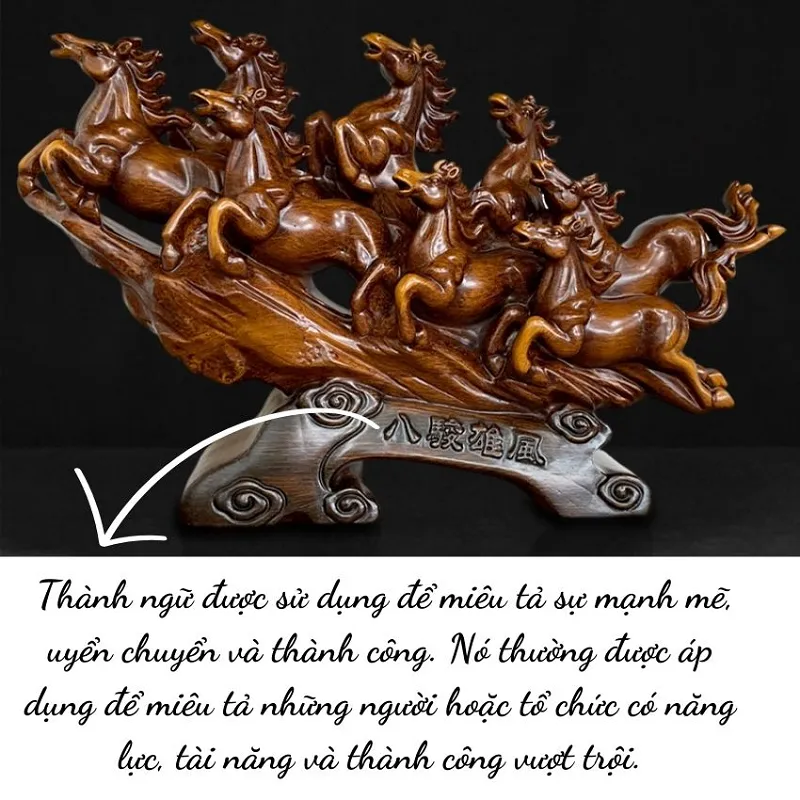 - Tượng Bát Mã Truy Phong (八骏追风) là biểu tượng nổi tiếng trong văn hóa Á Đông, đặc biệt trong phong thủy tài lộc và công danh. Hình ảnh tám chú ngựa dũng mãnh phi nước đại tượng trưng cho: