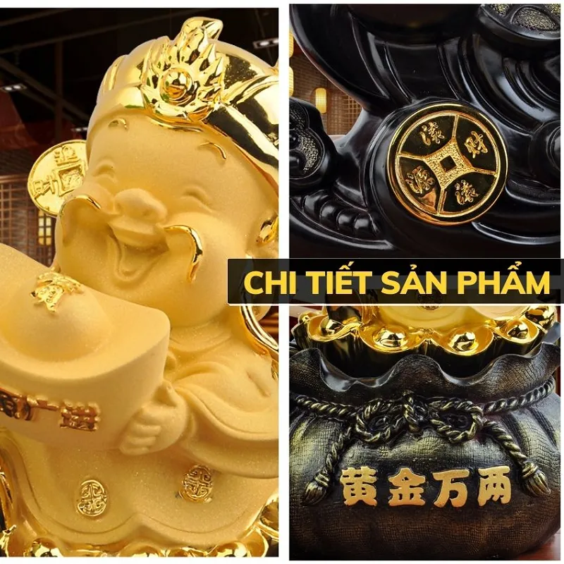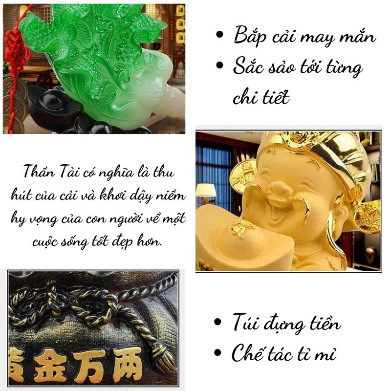 - Màu sắc: Thần Tài vàng kim, bắp cải xanh trắng ngọc, đế đen vững chắc