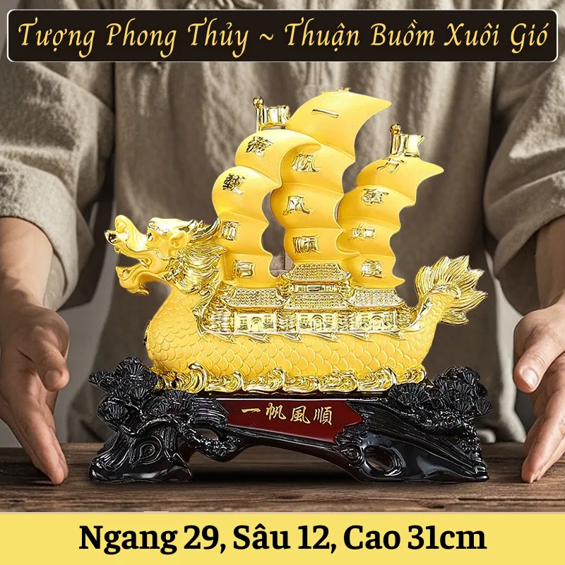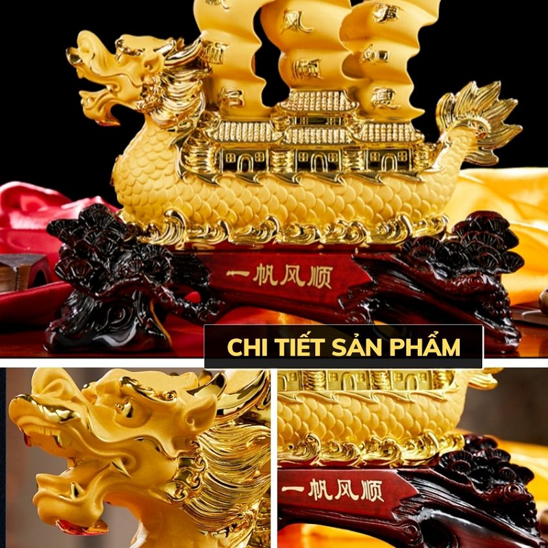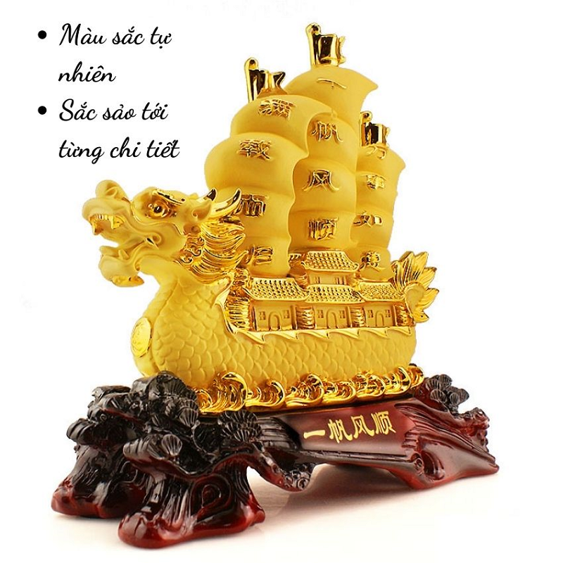 Tượng Thuyền Rồng Thuận Buồm Xuôi Gió phong thủy mang biểu tượng của may mắn, tài lộc và thành công. Sản phẩm chế tác tinh xảo, màu vàng sang trọng, phù hợp trưng bày phòng khách, phòng làm việc hoặc làm quà tặng khai trương, tân gia đầy ý nghĩa.
