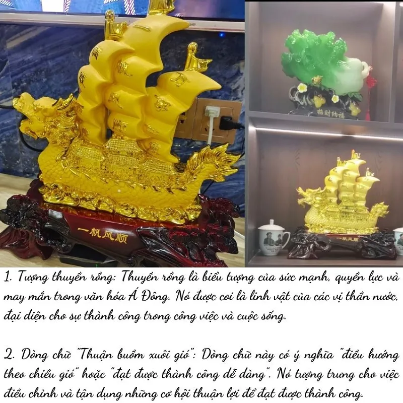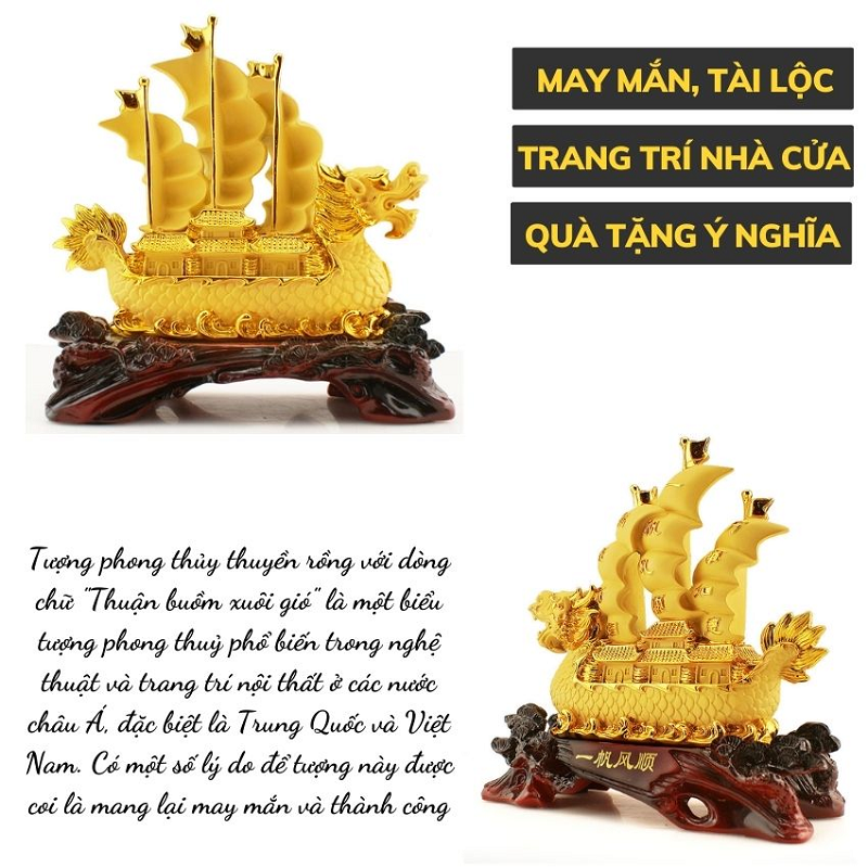 - Tượng Thuyền Rồng Thuận Buồm Xuôi Gió kết hợp hình ảnh rồng – biểu tượng quyền lực, trí tuệ và may mắn, với thuyền buồm – biểu tượng tiến bước, thành công, mang ý nghĩa:
